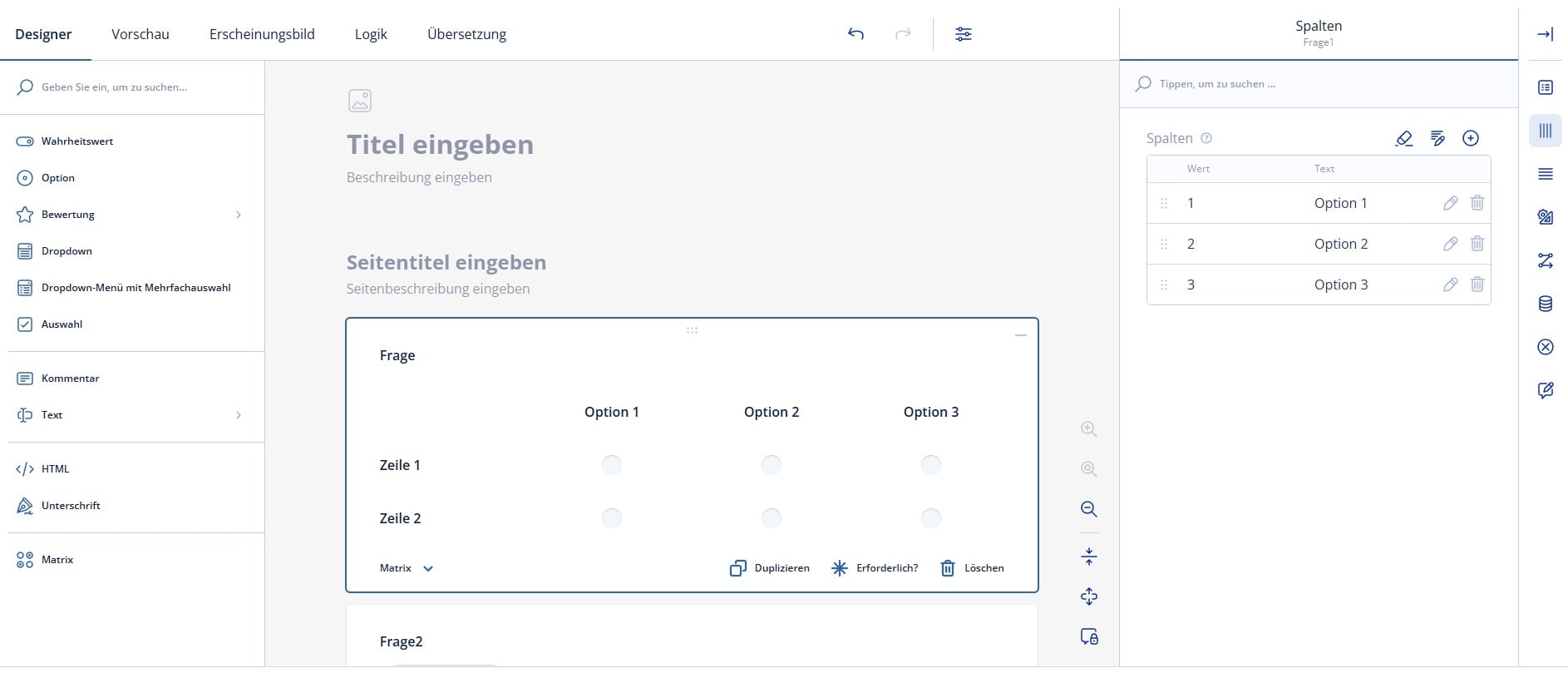 Im Bereich „Designer" wählen Sie die benötigten Elemente für Ihren Test aus (Fragen, Variablen, Werte etc.). Hier legen Sie außerdem die Reihenfolge und Struktur fest. Jedes Element kann individuell angepasst werden.