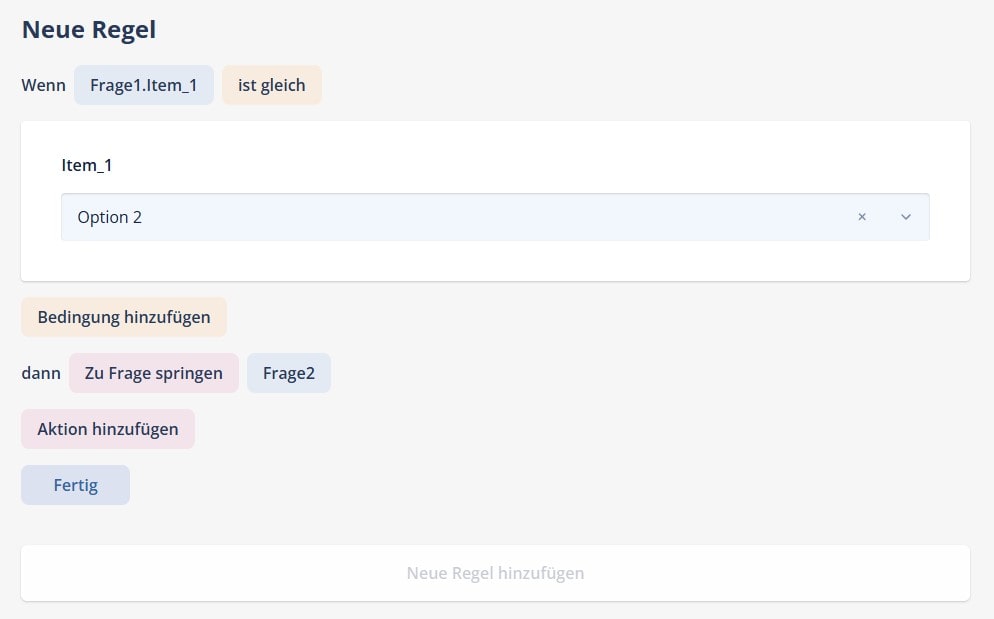 Im Bereich „Logik" können Sie einfache und komplexe Logikregeln erstellen. Alternativ können Sie ein Element im Bereich „Designer" anklicken und in der rechten Menüleiste auf den Tab „Logik" klicken. Hier können Sie Regeln definieren, wie z. B.: „Wenn bei Item_X die Auswahloption 2 gewählt wurde, dann soll Item_Y nicht angezeigt werden."