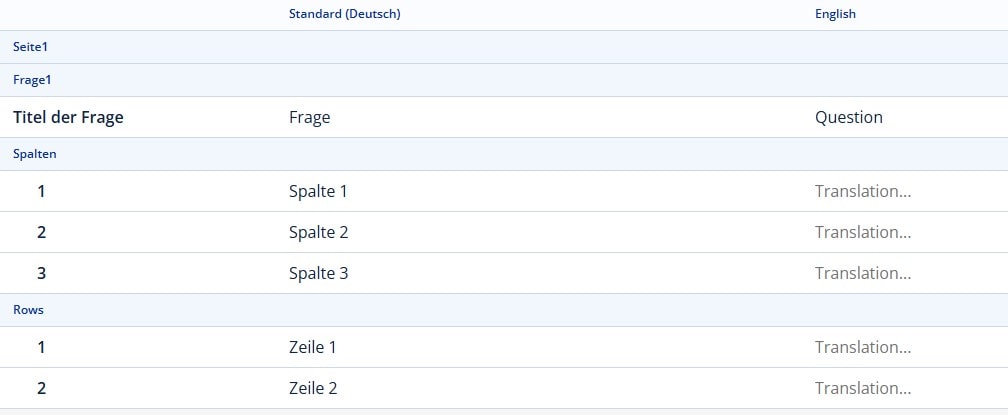 Matrix Dieses Element ist in vielen Fragebögen anzutreffen. Es weist folgende Struktur auf: eine übergeordnete Frage/Aussage, mehrere untergeordnete Fragen/Aussagen und eine Reihe gleichbleibender Antwortmöglichkeiten. Jede untergeordnete Frage/Aussage repräsentiert dabei eine eigene Variable.